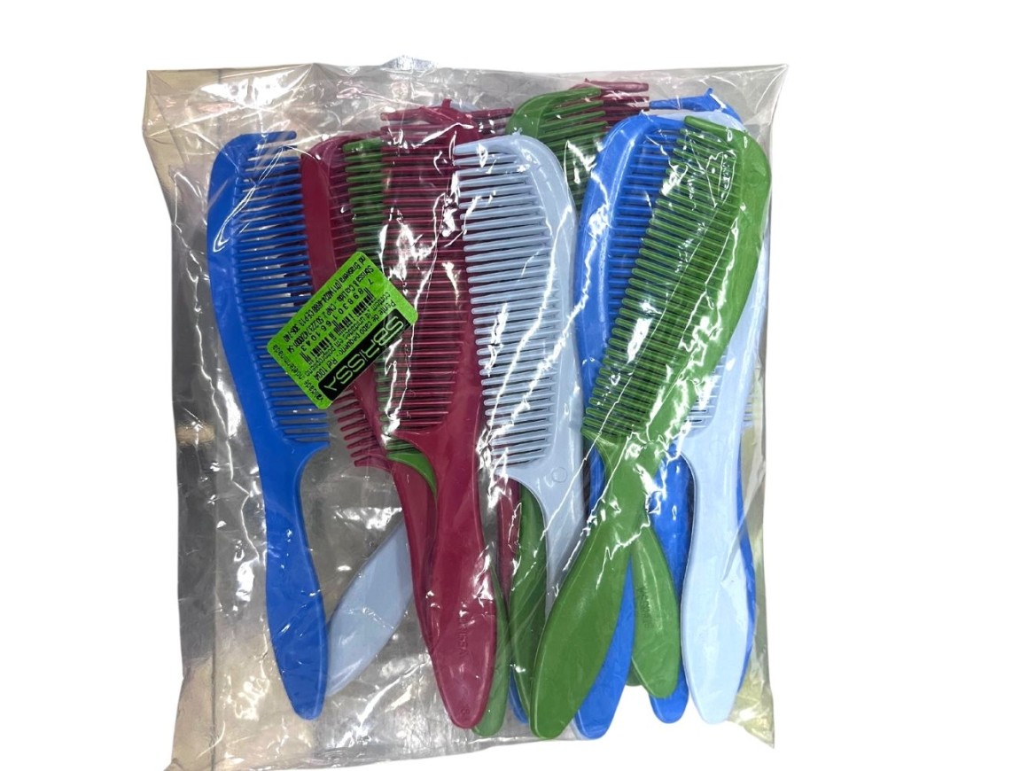 Pente em plástico, diversas cores, penteia o cabelo e massageia o couro cabeludo. Pode ser usado no cabelo molhado ou seco. Formato de cabo largo, anatômico. Leve e fácil de usar.