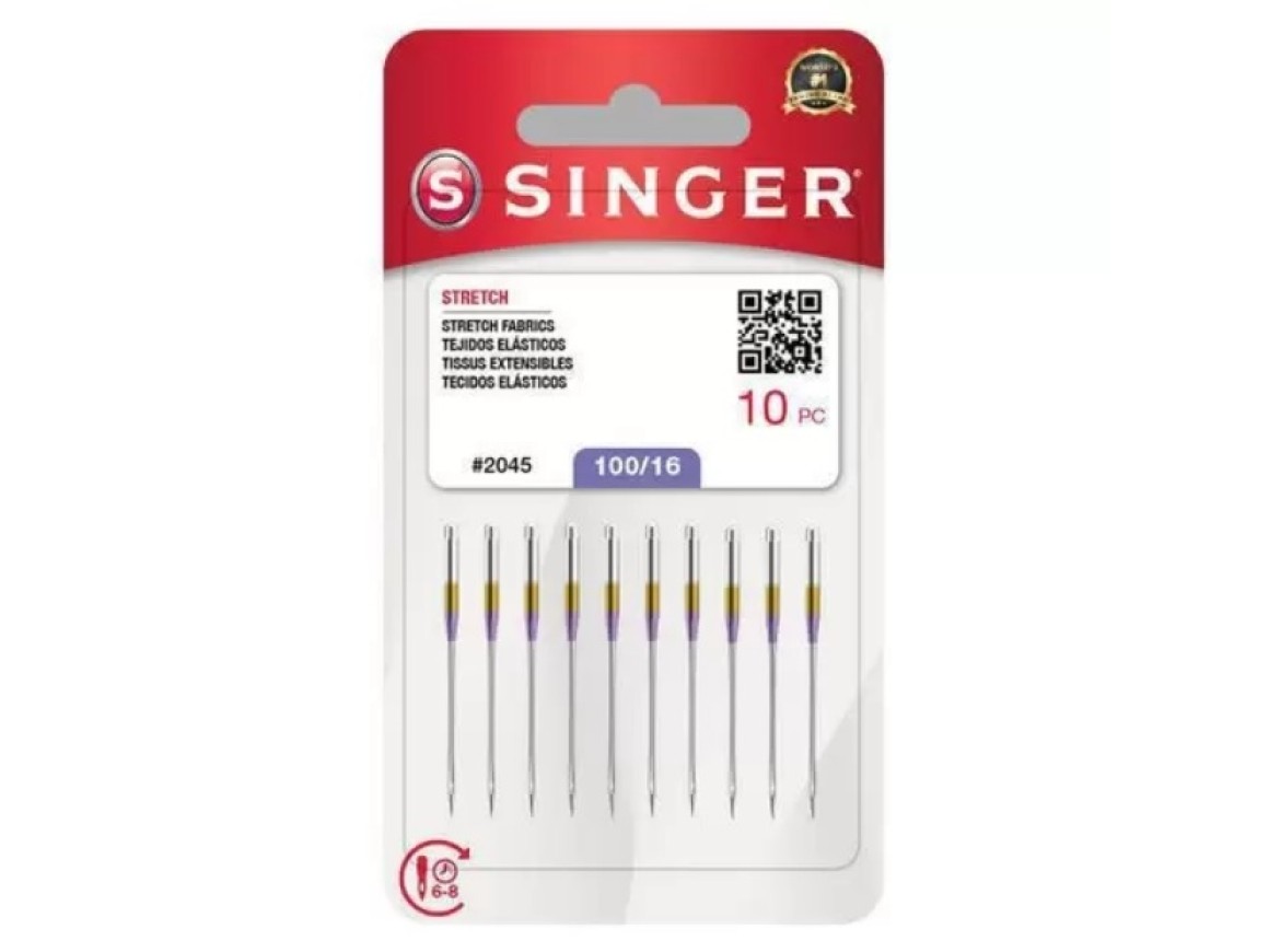 Agulha de Maquina Singer 2045 especial nº16 Agulha Equivalente: 130/705H-S Tipo de ponta: Bola pequena (06 LB) Embalagens: Blister com 10 agulhas Diâmetros: 100/16